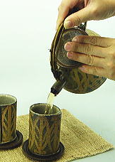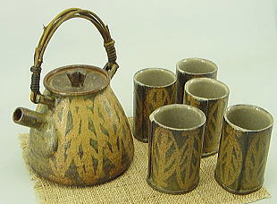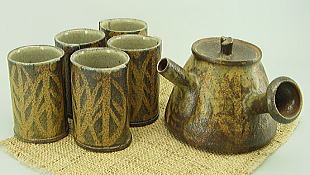 ![]() 木の葉模様が 縦長のデザインに似合う! 中学時代の校庭の 青桐の実の付き方が面白く イメージしました。 (付け根の点は実です。) ☆ツル付きの土瓶 ☆横手の急須 2種類、あります。 筒湯呑、5個セットです。 |