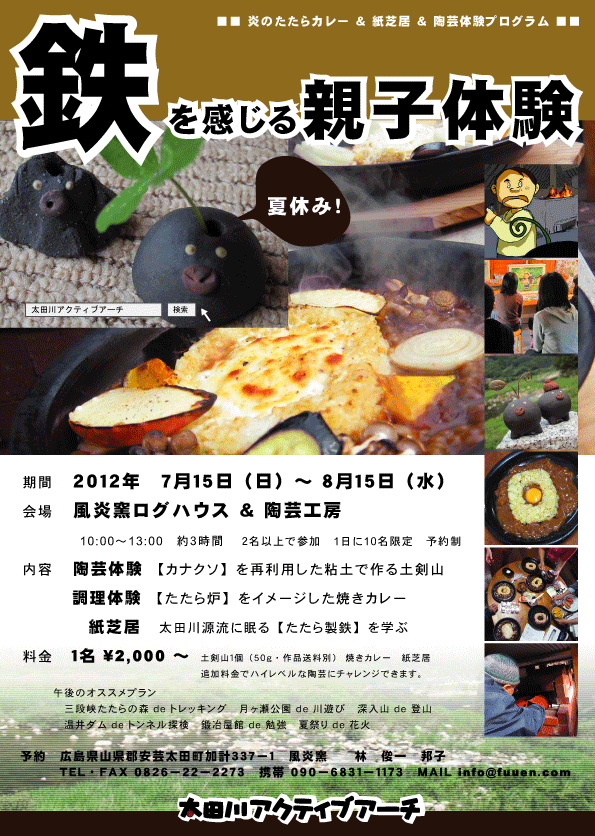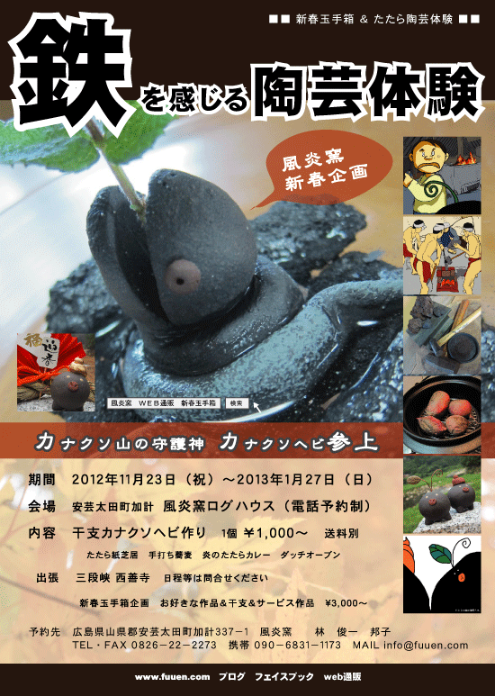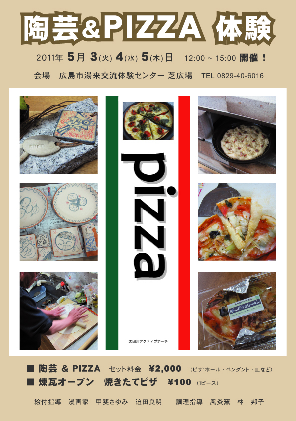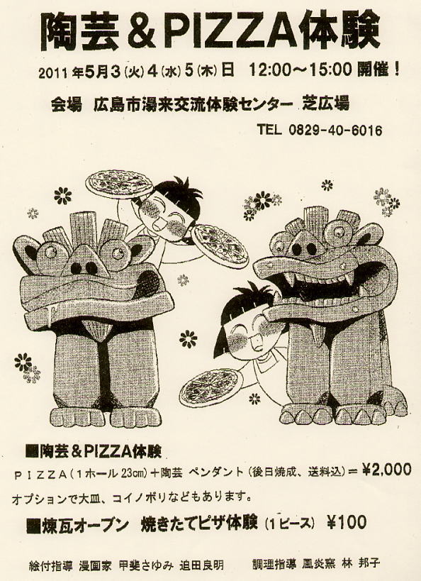 | 広島市湯来交流体験センター 調理体験室周辺 レンガオーブン設置 5月3・4・5日 12:00〜15:00 毎日予約優先20名 TEL 0826−22−2273 絵付指導 漫画家 甲斐さゆみ 陶芸&PIZZA指導 風炎窯 林邦子 参加料 ¥2,000 (陶芸品は後日焼成のち郵送) http://yuki-kouryu.jp/ |