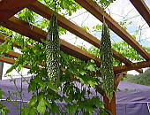 薄くスライスしたゴーヤを、水でさらし、削りぶしをかけ、ポン酢・土佐酢・醤油などで味付け バリバリと喰う。 天ぷらでも、ほろ苦くおいしい。 |