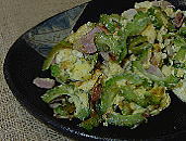 沖縄にはアバシリ、ゴーヤーがあり、苦味が少なく、太くて、ブツブツが大きく、 とてもおいしいです。 このゴーヤは今のところ、そちら(内地)のスーパー等で見かけないそうですね。 ゴーヤーチャンプルーは、沖縄では、おふくろの味で 各家庭で味付け、材料が微妙にちがいます。 手早く作るのがポイントで、炒め過ぎと、かき混ぜ過ぎは、苦くなり、色も悪くなります。 |