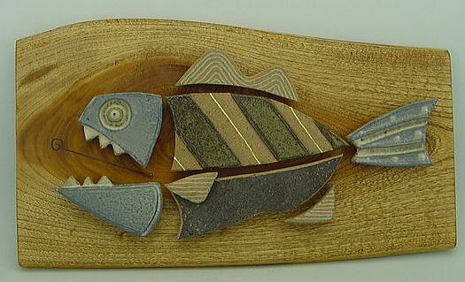 細部は結構コダワッテおります。 ※彫りに、白土スポイトの目玉。 ※白土、櫛目象嵌、削り出しのヒレ。 ※背のストライプはグリーンの灰釉薬で、細い線は、黄色の上絵焼付。 ※青化粧土に白土でスポイトの水玉模様のオヒレ。 ※黒釉薬の上から、チョー細かい点々で、ザラツイた腹。 ※真鍮を腐食させたウズマキ舌。 ![]() それらのパーツを、板から少し浮かせてボンドで接着しました。 微妙な陰影が立体感を醸し出しております。 ![]() 裏には金具がありますので、壁に掛けて良し、皿立でも良し。 重量は500g程で軽いですので、ボードの壁にも、ピンで掛けられます。 (さらに、大きいものもありますので、御相談くださいませ。¥20,000) ■ 風炎オヤジのつぶやき ■ これが陶器と言えるのかは、疑問? されど、常識にとらわれては、オモシロイ作品はできん! 怒った魚と、優しい木目のハーモニイ・・・ それは風炎オヤジだけの力ではありまへん! 木の優しさ、自然の恵に、乾杯! |