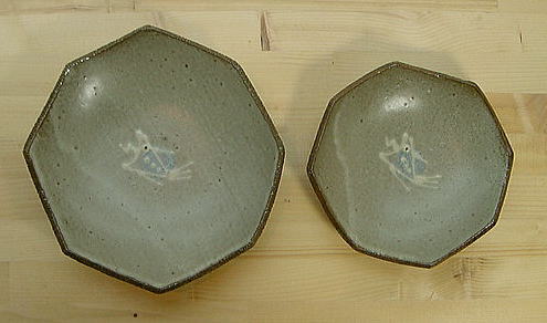 ![]() 手頃な大きさの八角平鉢です。 ツルッとした肌ざわりの艶消グレーの釉薬に、スポイト描きの魚紋です。 バックは薄っすらブルーで、目や舌のコダワリあり! 縁は茶色の灰釉薬で櫛目でギザギザ・・・・ 八角はハンドカットですので、微妙に歪んでおります。 う〜ん! 手作りなのだ!