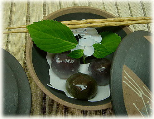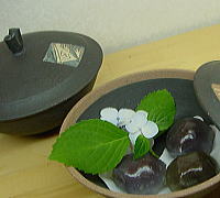 ■ 風炎オヤジのつぶやき ■ 先日、女流陶芸家のギャラリーに御邪魔いたしましたところ・・・ 8畳ほどの和室で、周辺に作品が飾られ、 部屋の真ん中に、座卓が鎮座しており、その上にさりげなく、カワイイ陶人形が大小で鎮座。 御茶を頂いたのですが、30cm角ほどの大皿に、小石や山野草が飾られ、 上品な和菓子と、ザックリした湯呑が盛られ、箱庭のようで・・・ 目の前に出され、接待されているという、迫力が御座いました。 ここまでされますと、買わずに帰るのは、かなりの勇気が必要だす! 「いつも、こんなにして御茶を出すんですか?」 「はい!野草は周辺にいくらでもありますし、菓子は頂きものです。」 「ここまでされますと、買わずに帰れませんが、これも作戦ですか?」 「ま〜それもありますが・・・ 元来、好きですから・・・」 その上、御土産まで頂きまして、有難う御座いました。 美人陶芸家の、さり気ないパフォーマンスには、ブチ、感心しましたが、 ブコツな風炎オヤジには、チト、似合いまへん! 今回の紫陽花を飾った魚紋タラフの冷い御菓子は、画像ですので食べれませんが、 見るのはタダ! されど、タダより怖いものはなし・・・ DOMO |