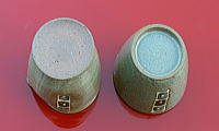 「そばちょこ」の内側はすべてワラ白釉薬で味のあるグレー色です。 「つゆ入れ」は、胴が微妙に凹んでいますので、握りやすいです。