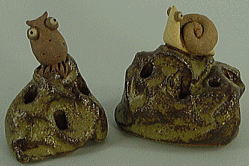 ![]() 土剣山は、 フクロウとカタツムリがあります。 お好きなほうを、お選びください。 本体は土をブッチギッテ、 穴をあけ渋いグリーンの灰釉。 フクロウ、カタツムリは 赤土・白土を、巧みに組み合わせた 手びねり! |