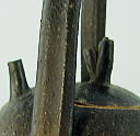 | ポットとか、徳利をイメージした、手つきの花器です。 小さな注ぎ口は、飾り(デザイン)で、注ぐには難しいであります。 手も陶器ですが、バーナード・リーチが、日本各地の民窯に伝えた、絞り技法です。 土の塊から、手で絞り込みながら伸ばすのですが これだけ長いハンドルは、かなりのハイテクニックと、自負しております。 |