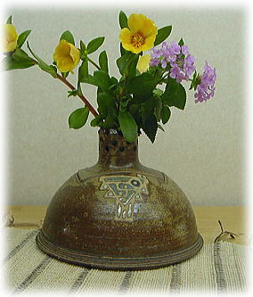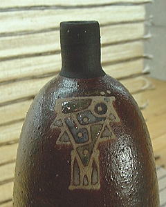 全体に渋い茶色の灰釉薬、焦げもあって深い味わいで御座います。 口と底は、艶消しの黒釉薬、底には細い櫛目あり! ビン型は、☆大 高33cmと、☆小 高22,5cmの、2種類あり、 どちらにも、琉球吹きガラスのフタが付いております。 花を活けなくても、ガラスが御洒落ですので、そのままインテリアにGOOD! さらに、さらに、☆大☆小を並べて飾りますと、なおさらGOOD! ![]() 白土スポイト魚紋は、青・緑・白・黒の釉薬で塗り分けて、▽でデザインしました。 |