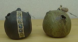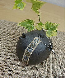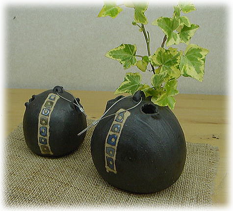 コロコロ可愛い、ボール花器! ユラユラ吊るして、ボール花器! ![]() グルグル、ロクロを回して、ボール玉! 上部に、3ヶ所、穴開けた! 人差し指で、ホジホジ・・・・ テッペンには飾りを兼ねたワイヤーがありますので、吊り下げも可能だす! ![]() ☆黒大 ☆黒小 ☆カタツムリ小 の3種類があります。 完璧な球形ではありませんので、歪んでおりますが、それがいい・・・ ☆大はソフトボール、☆小はテニスボールくらいの大きさです。 ☆黒は、艶消し釉薬で、白土のスポイトで幾何学模様。 濃いブルー、薄いブルー、グリーンで、ランダムに塗り分けております。 ☆カタツムリは、グリーンの灰釉薬で渋い色で、焦げもある。 テッペンにはカタツムリがチョコンと乗っております。