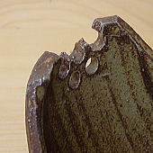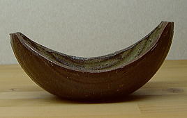 真横から見ますと、ギュインと反った形が良く解ります。 船型の、花器の長さは17cmくらいですが、 これも一つ一つ大きさが違いますので、大まかであるとご了承ください。 内側は、焦げ色のある深緑色の灰釉薬で、土味満点! 外側は焦げ茶色です。 貴方の暮らしの片隅にどうぞ!
