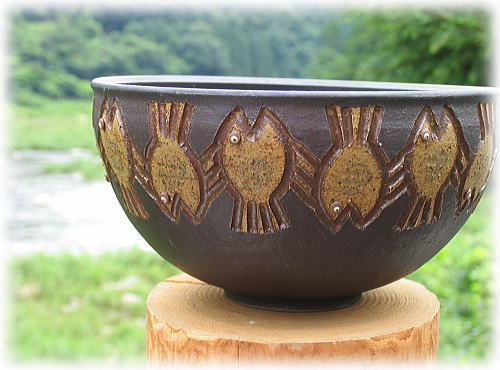 風炎窯らしい魚が連なるデザインの花器