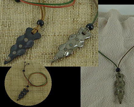 手びねりでスラット尖ったさかなさん。左は黒釉、右は白釉。紐は、まだら色。