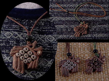 手びねりでデコボコさかなさん。左の胴はうす青、右の胴はこげ色。紐は、まだら色。
