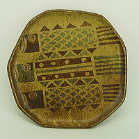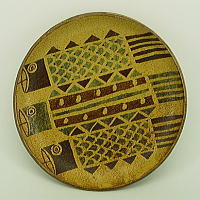 元気に風に吹かれた、こいのぼり! 板づくりで、径、約25cmあります。 家族の大盛りオカズや、 菓子皿にいかが! 渋い灰釉薬に、コゲ色があり、 風炎らしい色合いですね! 3匹重ねたパターンが面白い。 |