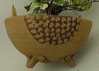 釉薬は掛かっていませんので、土だけのザラツイタ感触だす! 白土と、赤土と、マンガン釉で、デザインしました! 山羊のような、鹿のような・・・ でも一応、山羊です。 底に穴があいてますので、水やりされる場合は、トレー等で、工夫してください。 |