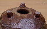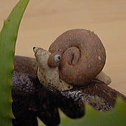 かたつむりは、無釉薬の土色。 ポットは、渋いグリーンの灰釉薬で、焦げでマダラになっておりますし、 形は、微妙に歪んだり凹んだりしています。 |
