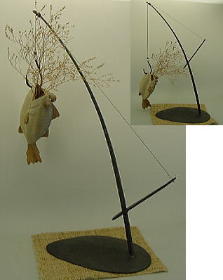 | D−020 鉄スタンドさかなつり花器 各¥20,000 size 高200 (さかな) 高520 (スタンド) 画像 実物に近い |