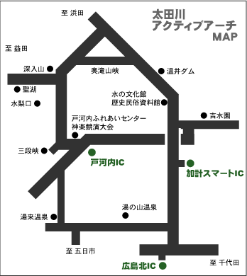 | ■ 1日周遊プラン 1 吉水園 ▼ 2 鍛冶屋館・街ぐるみ博物館 ▼ 3 歴史民俗資料館・水の文化館 ▼ 4 奥滝山峡・青松たたら遺跡 ▼ 5 深入山 ▼ 6 三段峡・水梨たたら遺跡 ▼ 7 聖湖・フィールドワークショップ ▼ 8 神楽競演大会 |