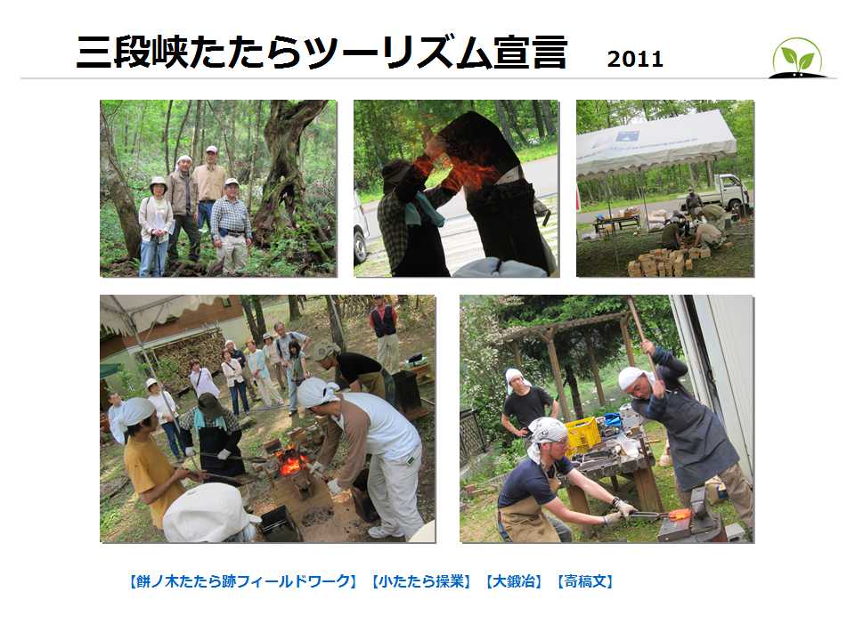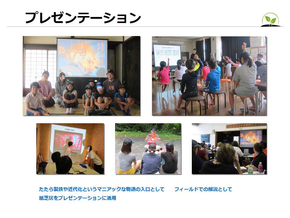 三段峡たたらツーリズム宣言 太田川水系のたたら製鉄の歴史は、かなりマニアックなので、 紙芝居や資料を使い、解り易いガイディングを心がけています。 |