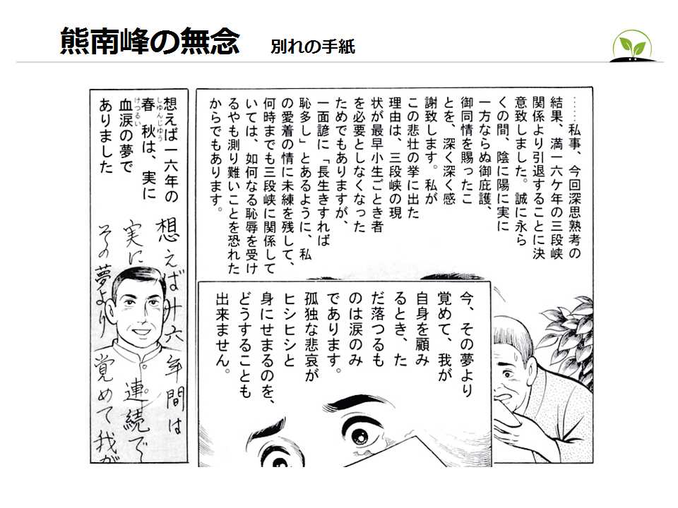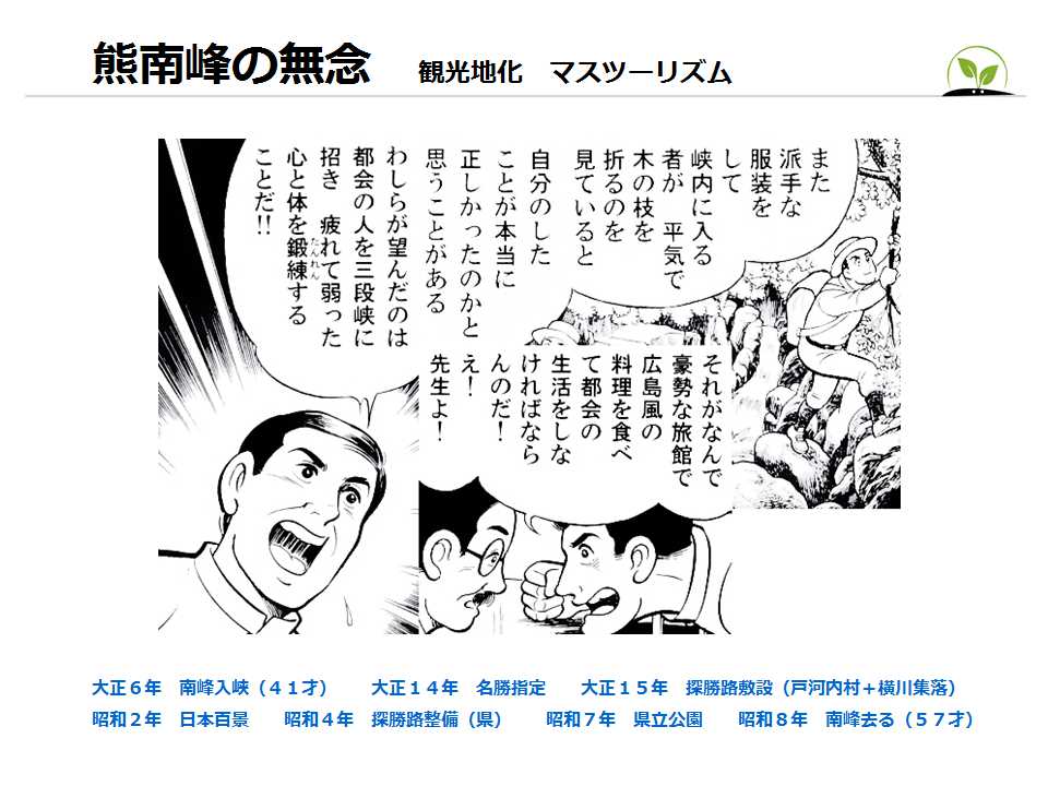 写真で、三段峡を世に広めた熊南峰は、10年間の戦場体験があり、 転地療法や癒しといったグリーンツーリズムの本質を理解していた。 彼の「無念」を知ることは、現代のエコツーリズムの本質を学ぶことになる。 |