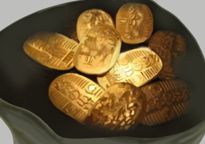 甚六) 「な、な、なんじゃこりゃ〜 丸いカナクソが、小判に生まれ変わったぞ。」