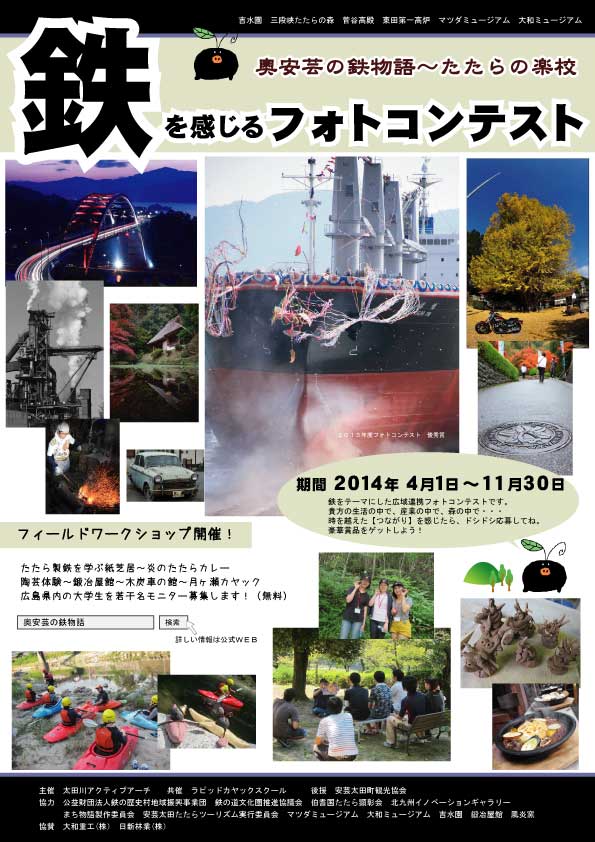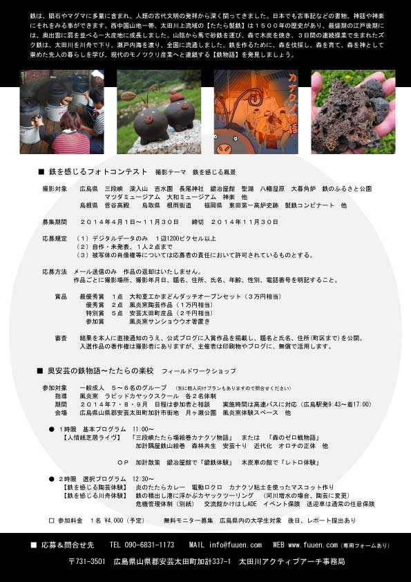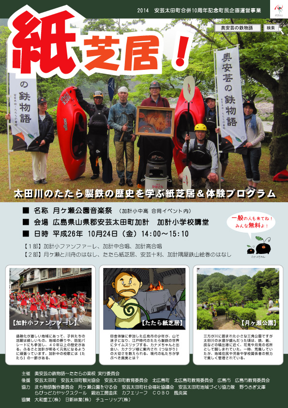 昨今、観光地では、その土地の歴史文化をベースにした物語性が重要視されています。 私共は、オリジナル紙芝居を使ったプレゼンテーションを軸に、各種ワークショップ、文化財や景勝地の散策を加えながら、奥安芸に眠る【鉄物語】を発信しています。 【森と人と鉄の共生】は、広島のモノツクリ産業のDNAであり、広島市や呉市の市民活動や企業活動にとって、大きな意味を持ちます。 |