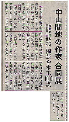 この度、中国新聞取材の展示風景の総天然色画像に、 風炎工房のギャラリーが選ばれ、風炎オヤジの巨漢が大きく、その面積を取り、 ムサクルシイ事でお詫び申し上げます。 なお、頭部と首元にあります地肌は、突発性の円形脱毛症ではなく、 天井からブラ下がっております「マンボウのモビール」でありますので、 ここにお知らせ致します。 |