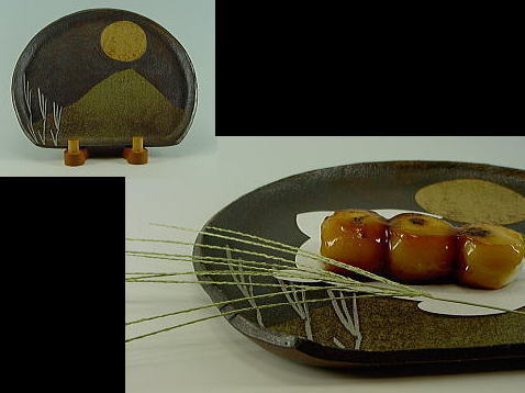 でっかい満月、ススキが三本。山なみは風炎工房、北側の五輪山に似てるな。
