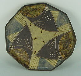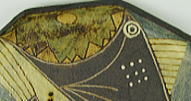 ![]() ★三匹魚紋平皿 三匹の魚が、揃って大口開けて 何かを食おうとしとる! ギザギザ歯が怖いざんす。 生きる為には食わねばならんのだ! 釉薬を塗り別けたり、線彫りしたり、 スポイトしたり、手間をかけまくっています。 使うには、チト派手ぎみですが 飾り皿にいいなあ〜。 丸いようで、角いようで 微妙に歪んだ形。 |