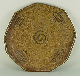 ![]() ★ひらめ平皿 ひらめが四匹、クルクル・・・ あまり見つめると、目が回るざんす! 渋い色で、ざらついた表面処理。 使ってみたくなる色じゃ、あ〜りませんか! ひらめはロウ抜きして、塗り分けています。 ヒレ、顔、渦巻きは、渋いグリーン 胴は、茶色です。 平らなので、大盛りパスタ、ピザなんかに お似合いでございます。 |