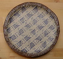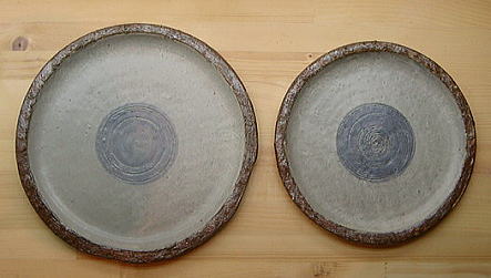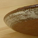 中心部の円は、ブルーが濃く、櫛目のストライプがあります。 茶色の縁は灰釉薬ですが、この部分だけ、モミガラを混入して、 独特なマチエールとなっております。 縁は立ち上がっていますので、多少のソース、汁は問題ありません!