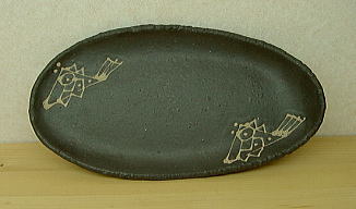 ほんわか楕円の皿は、優しいカーブですが、微妙に歪んでいます。 画像は反射で光っておりますが、落ち着いた艶消しの黒釉薬。 2匹の魚紋は、付かず離れず、泳いでおります。