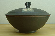 蓋のデザインで2種類ありますが、 どちらも2匹の魚紋が、アレンジされております。 広い蓋ですが、手取りは軽く、取っ手も持ち易く、可愛いデザインで、 艶消の黒釉薬は、モダンでシックな雰囲気で御座います。