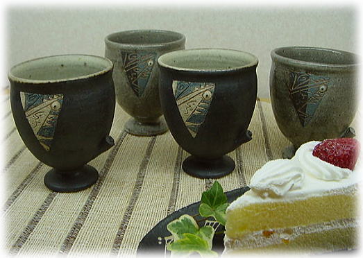 コロコロ並んだ、大口魚紋のカップ達・・・![]() 高台のついたタンブラー型の陶器カップはよくある。 されど、腰脇に飾りのポッチがある・・・ 握ってみれば、指に掛かり持ち易い・・・ 可愛くて、機能的でもある。 コーヒー、御茶、ビール、ジュース・・・ 何でも似合うのだ!