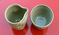 「そばちょこ」の内側はすべてワラ白釉薬で味のあるグレー色です。 「つゆ入れ」は、胴が微妙に凹んでいますので、握りやすいです。