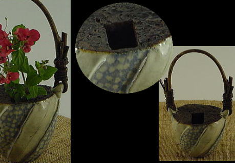 黒い部分は、モミガラ土で独特なマチエール。カズラの取っ手。