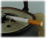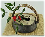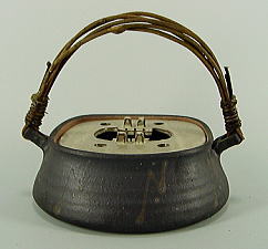 艶消しの黒釉薬に、銅釉薬で線模様。