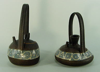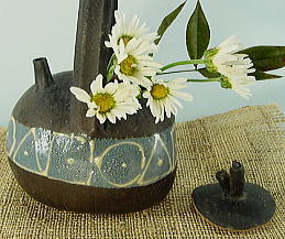 | ポットとか、徳利をイメージした、手つきの花器です。 小さな注ぎ口は、飾り(デザイン)で、注ぐには難しいであります。 手も陶器ですが、バーナード・リーチが、日本各地の民窯に伝えた、絞り技法です。 土の塊から、手で絞り込みながら伸ばすのですが これだけ長いハンドルは、かなりのハイテクニックと、自負しております。 |