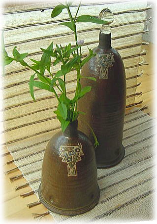 全体に渋い茶色の灰釉薬、焦げもあって深い味わいで御座います。 口と底は、艶消しの黒釉薬、底には細い櫛目あり! ビン型は、☆大 高33cmと、☆小 高22,5cmの、2種類あり、 どちらにも、琉球吹きガラスのフタが付いております。 花を活けなくても、ガラスが御洒落ですので、そのままインテリアにGOOD! さらに、さらに、☆大☆小を並べて飾りますと、なおさらGOOD! ![]() 白土スポイト魚紋は、青・緑・白・黒の釉薬で塗り分けて、▽でデザインしました。 |