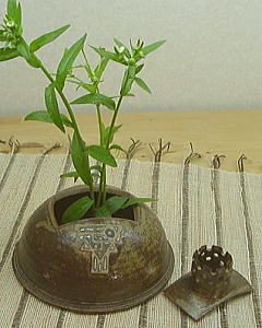 こちらは、平たいイメージの花器で安定感があります。 ![]() 口は穴ポコで、縁がギザギザですので、花が引っかかって活けやすい。 その上ナント、ポコッと外れ、付属の土ケンザンでも活けれますし、 香立てとしても、使えます。 その場合、フタを横に置いたりしますと、御洒落だす!