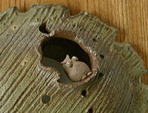 木の葉の部分は、板づくりで、渋いグリーンの灰釉。 よく見ると、ベージュの点々のポイントがあります。 ふちと、巣は、オヤジの指でぶっちぎり、 大胆で太い、くし目だね。 止まり木に、たたずむカワイイふくろう! 細かい仕事です。 ほ〜 ほ〜 ほ〜 ! |