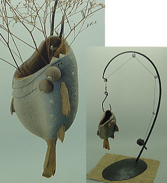 ![]() 鉄のスタンドに吊り下げた さかなつり花器です。 白土、青土、赤土・・・ 櫛目、線彫り、スポイト・・・ 背は、青のグラデーション! さかなは、各種の技法で、 艶消しで土味もあり、 カワイイだす! ワイヤーで吊り下げられ、 自在の☆カンヌキで、 高さの調整が出来ます。 インテリアや、 花のボリュームに合わせて、 楽しんでください。 鉄スタンドの高さが約52cm 結構なボリュームだす! |