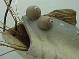 | ■ 風炎オヤジのつぶやき ■ 最近は、コラボレーションという言葉を、よく耳にしますね! 違った才能や素材が合体して、新しい価値を生み出すという事でしょうか・・・ 単体のさかなつり花器は、10年来の定番作品ですが、ついにここまで、進化したのだ! ラフスケッチをFAXして、佐藤工房さんに製作依頼をしております。 手作り陶器と同じで、製作のたび、微妙に違うのですが、いい味でがんす! DOMO |