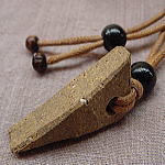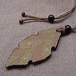 コートの襟、少し立てたら・・・ 季節がまたひとつ、駆け出してゆく・・・ 貴方の胸元には・・・ きれい、きれいな花よりも・・・ さり気ない土の色・・・ 枯葉舞う、秋なのね! ![]() アースカラーで、シックに、さり気なく・・・ 貴方の胸元を彩る、首飾り。 違う色の粘土を組み合わせた、練り込み技法。 さらには、白土のスポイトの斑点があり、裏は艶消しの黒釉薬です。 黒いウッドビーズに、ムラ染めのロウ紐をあしらっております。