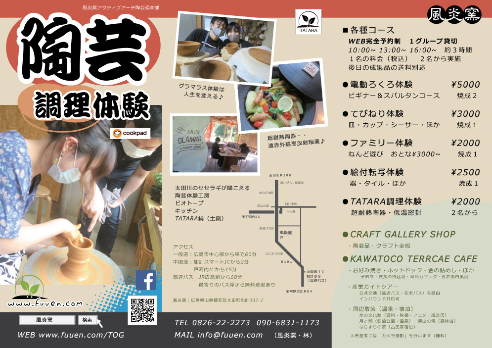 広島県安芸太田町加計にある「風炎窯アクティブアーチ陶芸倶楽部」は、1グループ貸切の体験スペース(エアコン、空気清浄機を完備)に加えて、クラフトギャラリー&カフェテラスを併設。陶芸歴40年の講師による懇切丁寧な指導で「皆さまの体験」を心からサポートいたします。また、中国自動車道加計スマートICから車で2分と近く、四方を山と川に囲まれた自然が豊かなところ。新設したKAWATOCOテラスでは、キッチンスタジオ、五右衛門風呂、釜炒り茶、ビオトープなどを提供しています♪