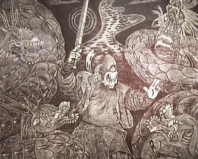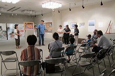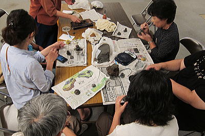 2013 「オロチの正体展〜鉄の物語」 に寄せて 加計隅屋鉄山絵巻 (広島県重要文化財) 江戸後期に、国内でも最大手の鉄山師に成長した加計隅屋が残した絵巻物で、 上巻(天地25cm、長さ6.4m)下巻(長さ8.5m)からなる。 たたら製鉄の作業工程として、 森林伐採、炭焼、たたら操業、ヒ出し、大鍛冶、勘定場、各種道具を写生しているが、 何処のたたら場を描いたのかは特定されていない。 作者の佐々木古仙斎は、江戸末期1794年生まれで、 芸北大暮の鍛冶屋の出とされる。 草稿本(下絵)として描かれたものだが、 それゆえの伸びやかな筆さばき、文章、労働者の所作の正確さへの評価が高い。 本画は原爆で焼失したものの、 日本独自のたたら製鉄の学術的な資料として、世界的にも大変貴重な絵画である。 ・・・・・・・・・・・・・・・・・・・・・・・・・・・・・・・・・・・・・・・・・・・・・・・・・・・・・・・・・・・・・・・・・ 1・操業風景 高殿(たたら吹屋)内部の暑くて過酷な操業風景。 マサ土で作った炉の中に、上から砂鉄と木炭を交互に投入し、 鞴からの送風によって激しく燃えているところ。 左右に設置された天秤鞴は大型であり、 番子が交代で踏むところが、カワリバンコの語源となる。 炉の下部から流れ出ているのが銑鉄(ズク)である。 村下は統括責任者であり、 炭を準備しているスミタキ、背後に金屋子が祀られている。 ・・・・・・・・・・・・・・・・・・・・・・・・・・・・・・・・・・・・・・・・・・・・・・・・・・・・・・・・・・・・・・・・・ 2・ヒ(ケラ)出し風景 操業を続けると炉のマサ土が融けて、だんだんと痩せてくる。 最後に炉を破壊したあと、中心部に生成されたヒを野外に引き出し、 鉄池に落として冷やしているところ。 池の水が沸騰するほどの熱量である。 屋根の排煙口や防火用水や梯子、ヒの下に敷くコロバシ木や鎖、 鉄屑を拾う子女、飼犬がいる。 ・・・・・・・・・・・・・・・・・・・・・・・・・・・・・・・・・・・・・・・・・・・・・・・・・・・・・・・・・・・・・・・・・ 3・大鍛冶風景 炉から出された銑鉄やヒを、割りながら選別したあと、 再加熱して、叩き鍛え、脱炭し、用途に合わせて品質を整えているところ。 リーダーの大工、右利き左利きを交えた4名の手子のチームワークが重要であり、 鉄棒にして出荷される。 加計まで馬で運ばれ、積出し港から川舟で太田川を下り、 さらに、瀬戸内海を大坂へと渡り、「山県割鉄」として全国に流通した。 ・・・・・・・・・・・・・・・・・・・・・・・・・・・・・・・・・・・・・・・・・・・・・・・・・・・・・・・・・・・・・・・・・ 砂鉄採取(カンナ流し) 砂鉄は、中国山地一帯のマサ土に約3%含有し、 水勢と比重を利用しながら選別したもので、大量の残土が川に流された。 それは、棚田や、広島デルタの生成と密接な関係がある。 太田川水系での砂鉄採取は、 洪水による氾濫防止のために、広島城の築城に合せて全面禁止された。 のち、砂鉄は石見などの山陰側から馬で運ばれ、 砂鉄の採取と運搬は、農家の農閑期の副業であった。 ・・・・・・・・・・・・・・・・・・・・・・・・・・・・・・・・・・・・・・・・・・・・・・・・・・・・・・・・・・・・・・・・・ 森林共生 1回の操業は3〜4昼夜の連続操業であり、 約15tの砂鉄と、約15tの木炭(1.5ha=サッカーコート2面分の森林)を消費し、 約3〜4tの鉄が生まれた。 森林の伐採は激しいものであったが、 一部を残したり、植林したり、10年単位でたたら場を移動したりと、保護に努めた。 また、たたら場には御神木があり、祈りの対象であった。 諸外国では、森林を枯渇させた事例が多く、製鉄は環境破壊としてみられるが、 実は、樹木が成長する過程で、多くの酸素を排出する。 中国山地では、循環的なエネルギー活用を行っていた。 ・・・・・・・・・・・・・・・・・・・・・・・・・・・・・・・・・・・・・・・・・・・・・・・・・・・・・・・・・・・・・・・・・ 安芸十り 広島は、日本でも最古級の弥生後期〜古墳時代の製鉄遺跡が発見されている。 (三原の小丸遺跡、千代田の京野遺跡、世羅のカナクロ谷遺跡) 中世には、かなりの数のたたら場があったが、 すでに地面からの湿気を防ぐ工夫があり、技術革新は先進的であった。 江戸期には、ジャストインによる材料供給、昼夜交代制、海上運搬など、 すでに現代的な企業経営がされていた。 たたら場の労働者は3〜4百人とされるが、 炭焼、砂鉄採取、運搬などを合せると数千人規模の産業であった。 明治初頭の加計隅屋の廃業で、太田川水系のたたら製鉄は姿を消したが、 原因は、安価な西洋鉄の大量流入や、良質な砂鉄の枯渇とされている。 のち、西洋の技術を導入した角炉が生まれ、 山中に放棄されていた鉄滓(カナクソ)を掘り出して、再利用した。 (大暮の山県製鉄、加計の帝国製鉄など) 角炉とは、耐火煉瓦によ